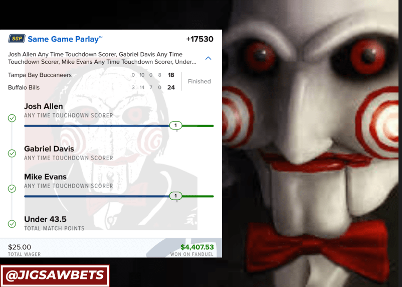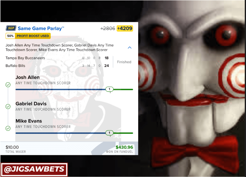 10/26 TNF SGP HITS! Discover more from JigsawBets Subscribe to get the latest posts sent to your email. Type your email… Subscribe Share this: Share on X (Opens in new window) X Share on Facebook (Opens in new window) Facebook Like Loading... Related