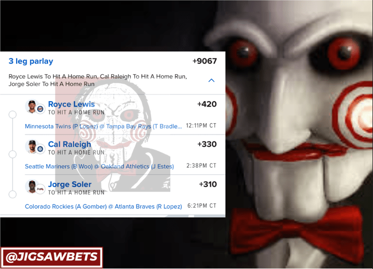 9/5 HR Parlays Discover more from JigsawBets Subscribe to get the latest posts sent to your email. Type your email… Subscribe Share this: Share on X (Opens in new window) X Share on Facebook (Opens in new window) Facebook Like Loading... Related