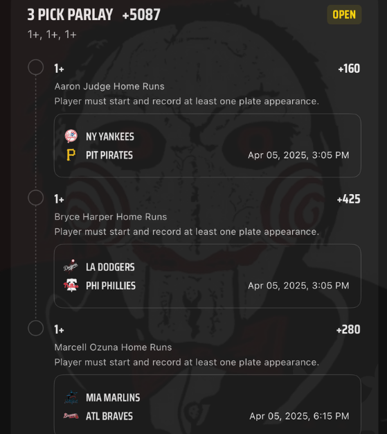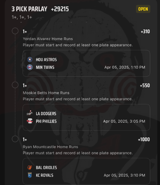 4/5 HR Parlays Discover more from JigsawBets Subscribe to get the latest posts sent to your email. Type your email… Subscribe Share this: Share on X (Opens in new window) X Share on Facebook (Opens in new window) Facebook Like Loading... Related