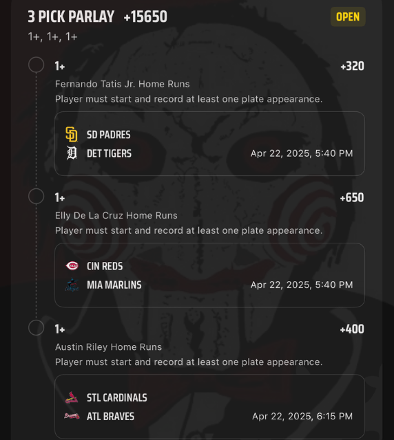 4/22 HR Parlay Discover more from JigsawBets Subscribe to get the latest posts sent to your email. Type your email… Subscribe Share this: Share on X (Opens in new window) X Share on Facebook (Opens in new window) Facebook Like Loading... Related