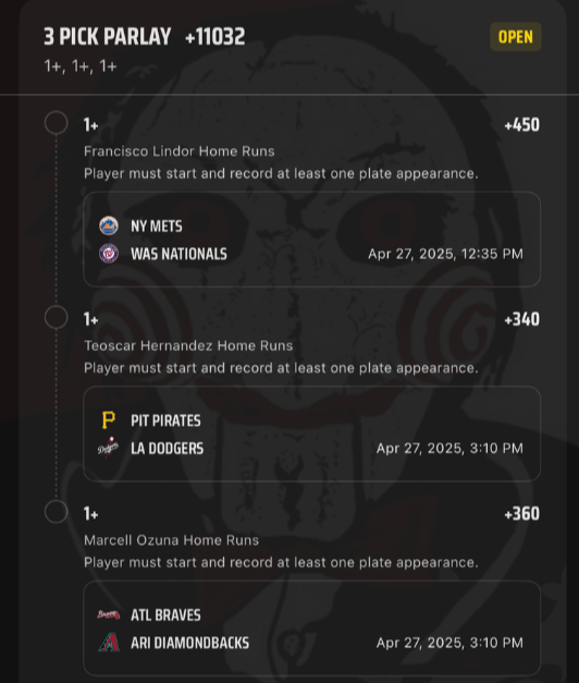 4/27 HR Parlays Discover more from JigsawBets Subscribe to get the latest posts sent to your email. Type your email… Subscribe Share this: Share on X (Opens in new window) X Share on Facebook (Opens in new window) Facebook Like Loading... Related