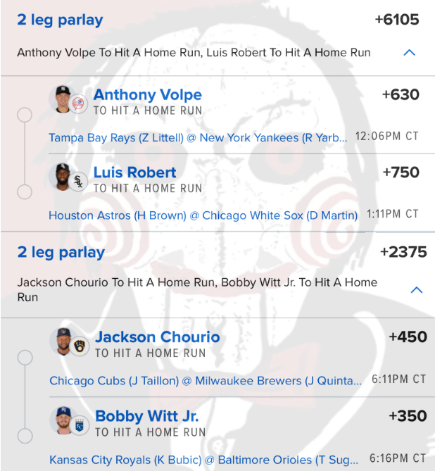 5/3 HR Parlays Discover more from JigsawBets Subscribe to get the latest posts sent to your email. Type your email… Subscribe Share this: Share on X (Opens in new window) X Share on Facebook (Opens in new window) Facebook Like Loading... Related