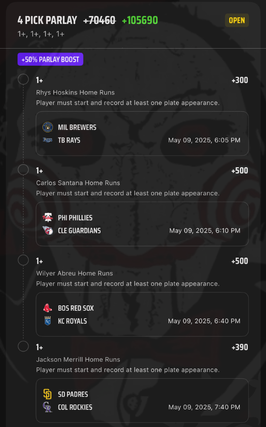 5/9 HR Parlay Discover more from JigsawBets Subscribe to get the latest posts sent to your email. Type your email… Subscribe Share this: Share on X (Opens in new window) X Share on Facebook (Opens in new window) Facebook Like Loading... Related