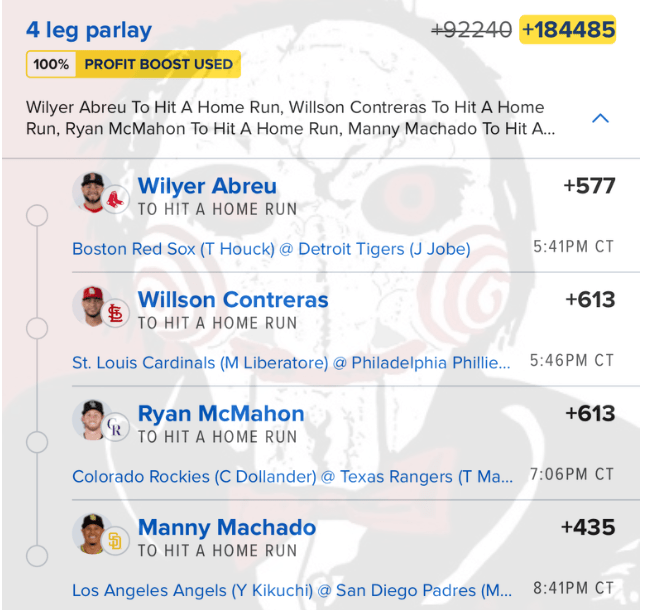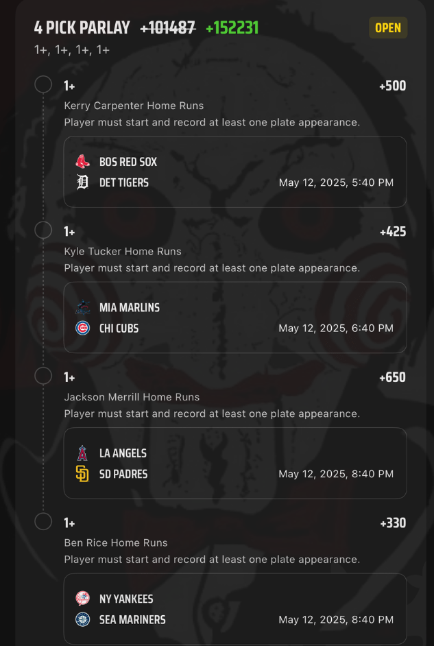 5/12 HR Parlays Discover more from JigsawBets Subscribe to get the latest posts sent to your email. Type your email… Subscribe Share this: Share on X (Opens in new window) X Share on Facebook (Opens in new window) Facebook Like Loading... Related