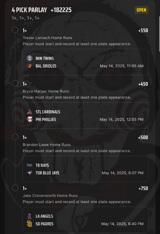 5/14 HR Parlay Discover more from JigsawBets Subscribe to get the latest posts sent to your email. Type your email… Subscribe Share this: Share on X (Opens in new window) X Share on Facebook (Opens in new window) Facebook Like Loading... Related