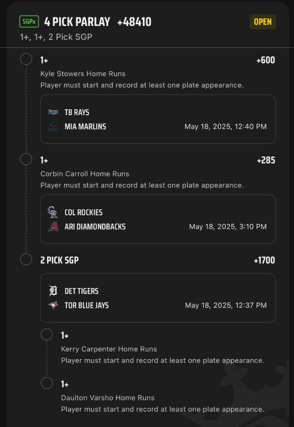 5/18 HR Parlay Discover more from JigsawBets Subscribe to get the latest posts sent to your email. Type your email… Subscribe Share this: Share on X (Opens in new window) X Share on Facebook (Opens in new window) Facebook Like Loading... Related