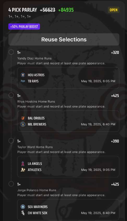5/19 HR Parlay Discover more from JigsawBets Subscribe to get the latest posts sent to your email. Type your email… Subscribe Share this: Share on X (Opens in new window) X Share on Facebook (Opens in new window) Facebook Like Loading... Related