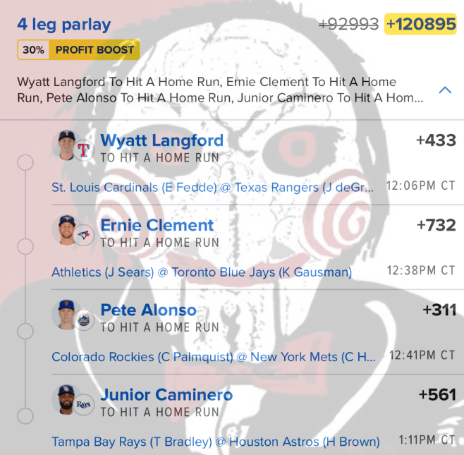 6/1 HR Parlay Discover more from JigsawBets Subscribe to get the latest posts sent to your email. Type your email… Subscribe Share this: Share on X (Opens in new window) X Share on Facebook (Opens in new window) Facebook Like Loading... Related