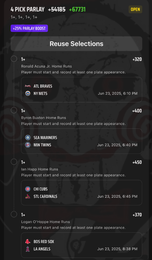 6/23 HR Parlay Discover more from JigsawBets Subscribe to get the latest posts sent to your email. Type your email… Subscribe Share this: Share on X (Opens in new window) X Share on Facebook (Opens in new window) Facebook Like Loading... Related