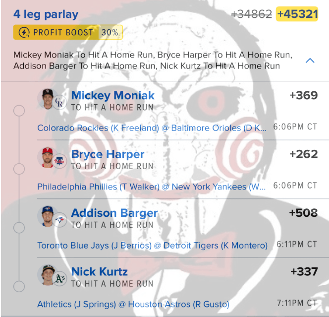 7/25 HR Parlay Discover more from JigsawBets Subscribe to get the latest posts sent to your email. Type your email… Subscribe Share this: Share on X (Opens in new window) X Share on Facebook (Opens in new window) Facebook Like Loading... Related