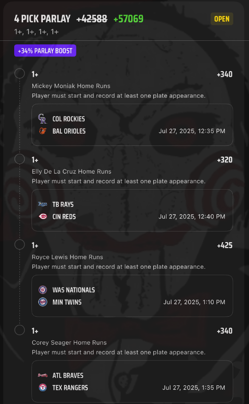 7/27 HR Parlay Discover more from JigsawBets Subscribe to get the latest posts sent to your email. Type your email… Subscribe Share this: Share on X (Opens in new window) X Share on Facebook (Opens in new window) Facebook Like Loading... Related