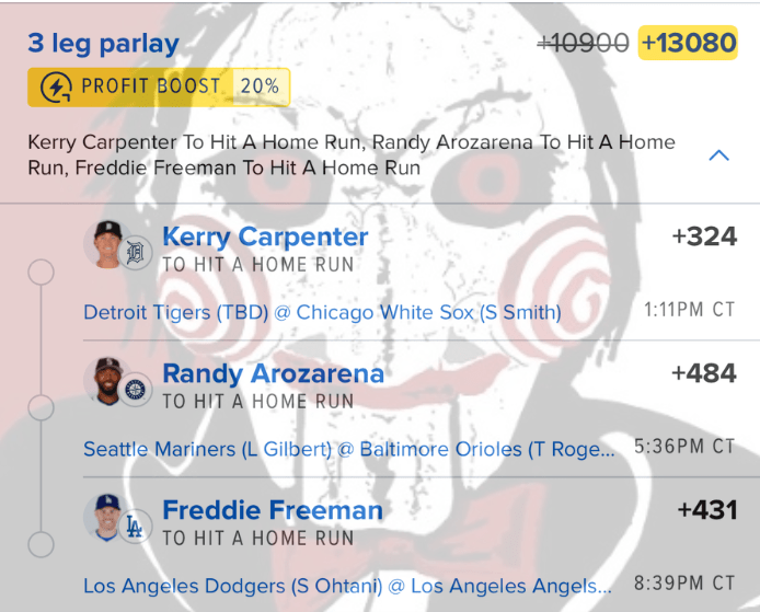 8/13 HR Parlay Discover more from JigsawBets Subscribe to get the latest posts sent to your email. Type your email… Subscribe Share this: Share on X (Opens in new window) X Share on Facebook (Opens in new window) Facebook Like Loading... Related