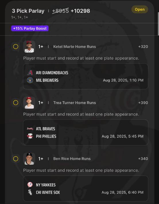 8/28 HR Parlay Discover more from JigsawBets Subscribe to get the latest posts sent to your email. Type your email… Subscribe Share this: Share on X (Opens in new window) X Share on Facebook (Opens in new window) Facebook Like Loading... Related