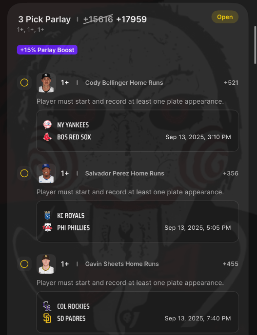 9/13 HR Parlay Discover more from JigsawBets Subscribe to get the latest posts sent to your email. Type your email… Subscribe Share this: Share on X (Opens in new window) X Share on Facebook (Opens in new window) Facebook Like Loading... Related