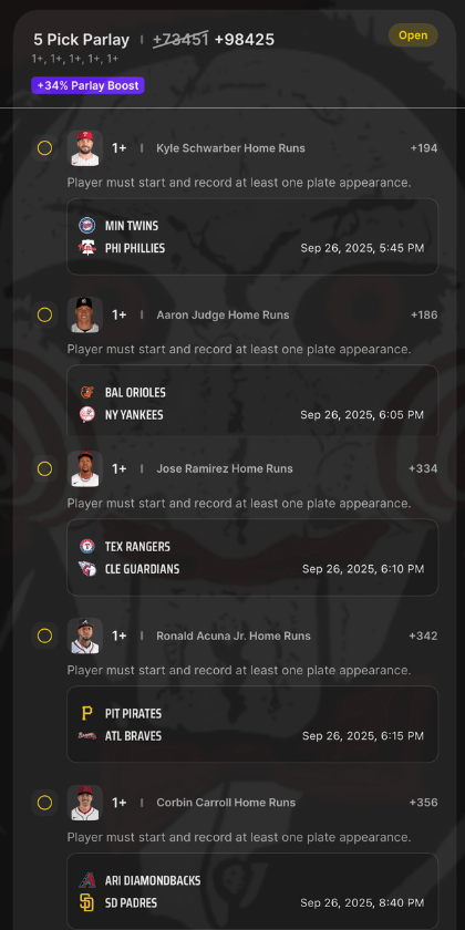 9/26 HR Parlay Discover more from JigsawBets Subscribe to get the latest posts sent to your email. Type your email… Subscribe Share this: Share on X (Opens in new window) X Share on Facebook (Opens in new window) Facebook Like Loading... Related