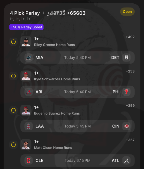 4/10 HR Parlay Discover more from JigsawBets Subscribe to get the latest posts sent to your email. Type your email… Subscribe Share this: Share on X (Opens in new window) X Share on Facebook (Opens in new window) Facebook Like Loading... Related
