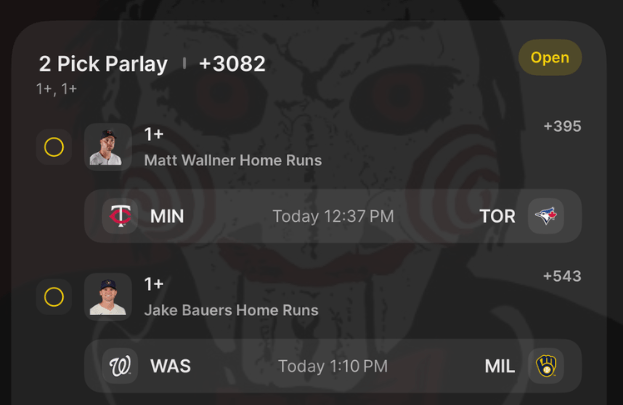4/12 HR Parlay Discover more from JigsawBets Subscribe to get the latest posts sent to your email. Type your email… Subscribe Share this: Share on X (Opens in new window) X Share on Facebook (Opens in new window) Facebook Like Loading... Related