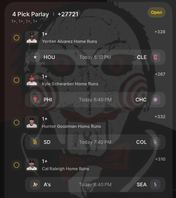 4/21 HR Parlay Discover more from JigsawBets Subscribe to get the latest posts sent to your email. Type your email… Subscribe Share this: Share on X (Opens in new window) X Share on Facebook (Opens in new window) Facebook Like Loading... Related