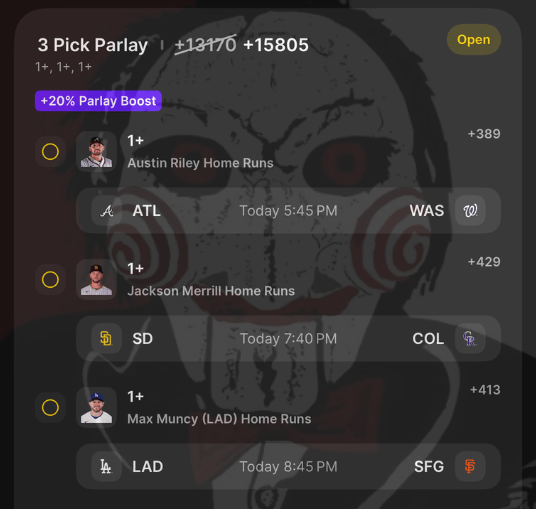 4/22 HR Parlay Discover more from JigsawBets Subscribe to get the latest posts sent to your email. Type your email… Subscribe Share this: Share on X (Opens in new window) X Share on Facebook (Opens in new window) Facebook Like Loading... Related
